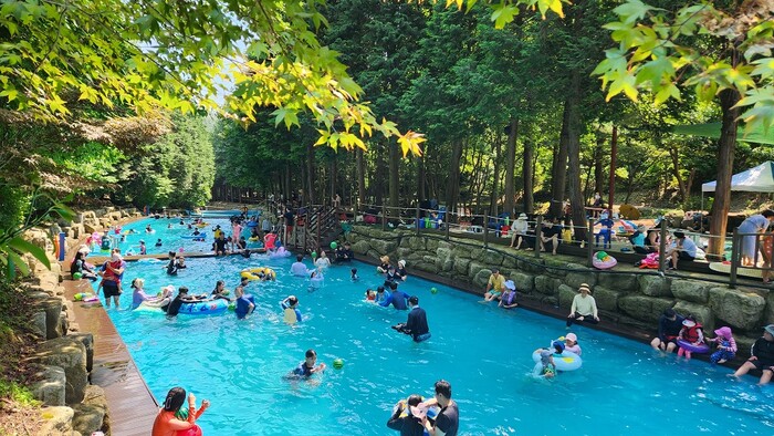 | ▲ 초당림 물놀이장에서 시원한 산바람 아래, 피서를 즐기고 있는 피서객들 / 강진군 제공 |