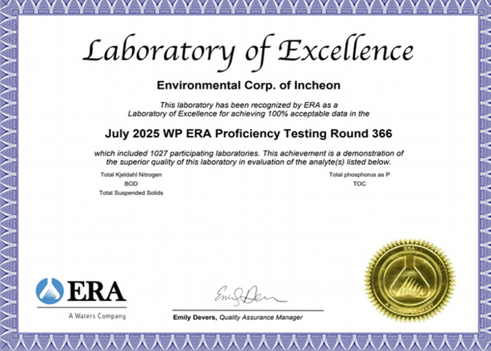 이번 평가는 7월부터 8월까지 전 세계 1,027개의 유수 분석기관들이 참여, 경쟁을 펼쳤으며 환경연구소는 수질 분야 핵심 항목인 생물화학적 산소요구량(BOD), 총유기탄소(TOC), 부유물질(SS), 총질소(T-N), 총인(T-P) 등 5개 항목에서 모두 ‘만족(Satisfactory)’이라는 최상의 결과를 얻었다.