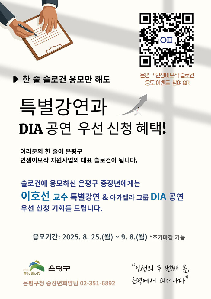 응모 대상은 은평구민이라면 누구나 참여할 수 있다. 특별한 혜택으로 응모에 참여한 중장년 구민 최대 80명에게는 10월 23일 은평문화예술회관 숲속극장에서 열리는 ‘이호선 교수 초청 중장년 특별강연’ 우선 신청 기회가 제공된다.