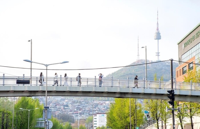 | ▲ 지난 주말 녹사평 육교에서 관광객이 촬영을 하고 있다. (사진=용산구청 제공) |