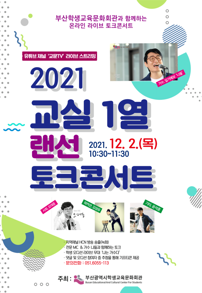 부산학생교육문화회관(관장 김영진)은 12월 2일 오전 10시 30분 입시와 코로나19로 지친 학생들과 교사들을 위해‘교실 1열 랜선 토크콘서트’를 연다.