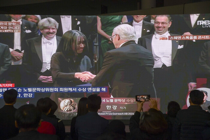 [광주=정찬남 기자] 한강 작가 노벨문학상 수상기념 시민 축하행사가 11일 새벽 광주광역시청 시민홀에서 열린 가운데 강기정 광주광역시장과 시민들이 한강 작가의 노벨 문학상 수상을 생방송으로 시청하며 축하하고 있다./광주광역시 제공