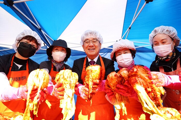 [시민일보 = 이대우 기자] 문헌일 구로구청장이 최든 구청 광장에서 열린 사랑의 김장 나누기 행사장에서 자원봉사자들과 함께 김치를 담궛다.