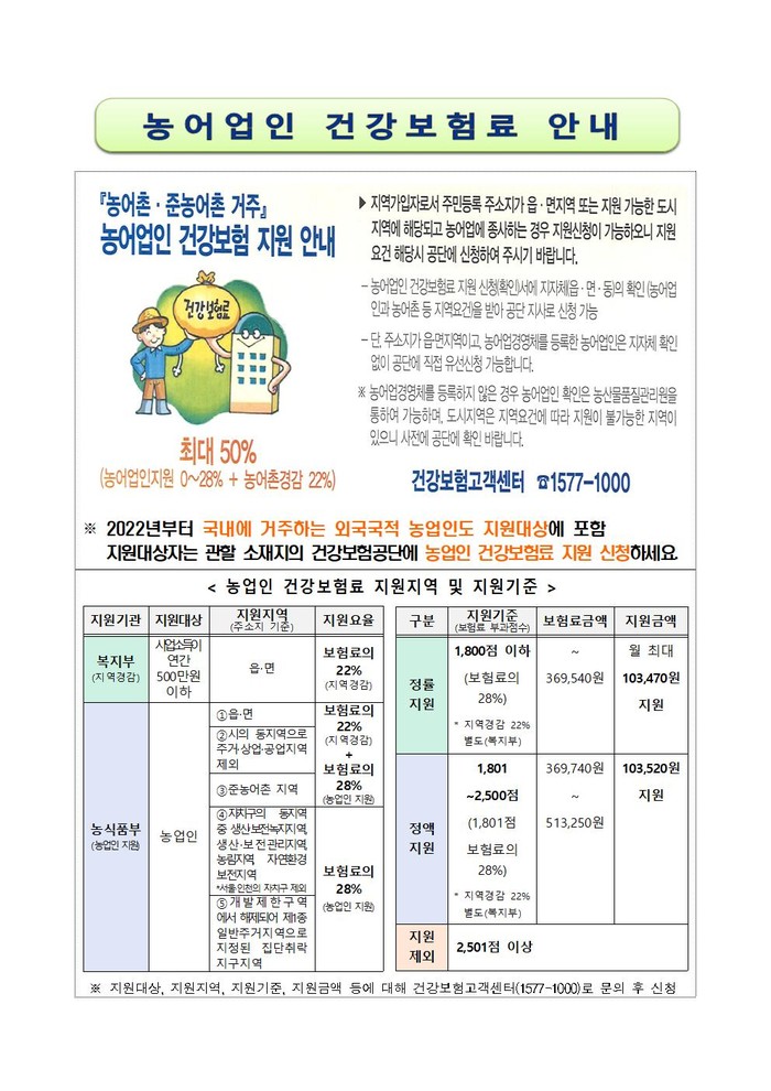 시 관계자는 “지원대상에 해당하는 농촌에 거주하는 농업인은 꼭 신청하시어 건강보험료 혜택을 받길 바란다”고 당부했다.