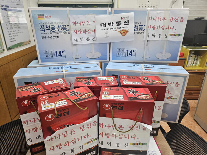 이날 기탁받은 선풍기와 라면은 김경섭 대박통신 대표의 뜻에 따라 관내 취약계층에 전달할 예정이다.