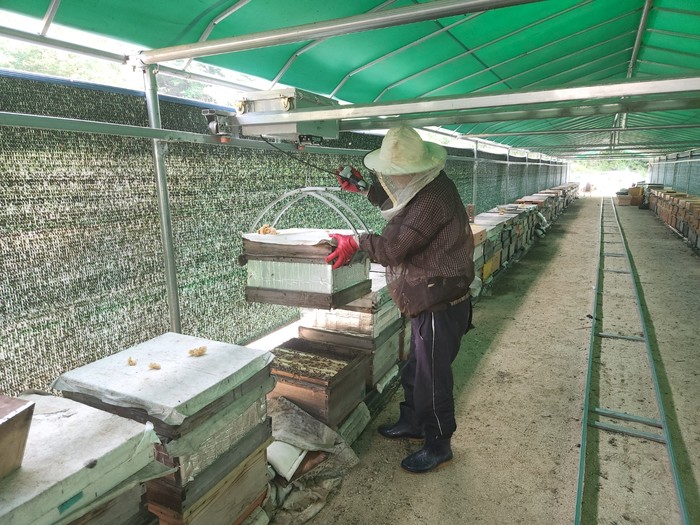 고품질 꿀 생산 사육환경 개선 시범사업인 ‘천장 개폐형 비가림시설’은 봄철 햇빛을 벌통이 받을 수 있게 하고 측창이 있어 외부 비, 바람에 보호될 수 있어 보온 관리가 가능하다. 또한 레일식 내검기(벌통을 들어 올리는 장치)가 있어 무거운 2단 계상벌통을 들어 올려 아래쪽 벌통을 편리하게 관리할 수 있어 반복되는 작업으로 인한 근골격계질환 예방을 할 수 있다. 그리고 이상기후로 인한 변덕스러운 날씨에도 양봉농가는 자유롭게 작업할 수 있어 매우 유용하다.