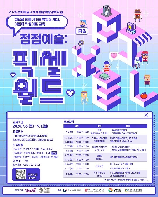 ‘점으로 만들어가는 특별한 세상, 어린이 픽셀아트 교육’이란 부제가 붙은 <점점예술:픽셀월드>는 지역 미디어아트 예술가와 함께하는 미디어와 미술 융.복합 문화예술교육 프로그램으로 총 10회차에 걸쳐 진행된다.