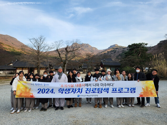 | ▲ 해남교육지원청, 해남학생자치회 중학생 16명, 고등학생 24명 대상 지난 12일부터 20일까지 ‘호국사찰에서 나와 마주하다’ 주제 학생자치 진로탐색 프로그램 운영 자료시잔 / 해남교육지원청 제공 |