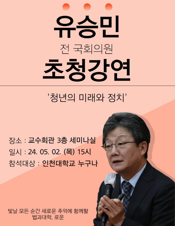 이날 유 전 의원은 인천대 법학부 학생들과‘청년의 미래와 정치’라는 주제로 2시간 동안 자유롭게 강의하면서 소통할 계획으로 정치·경제·사회 전반에 걸쳐 아젠다를 제시하고 대학의 지성을 꽃 피울 것으로 기대된다.