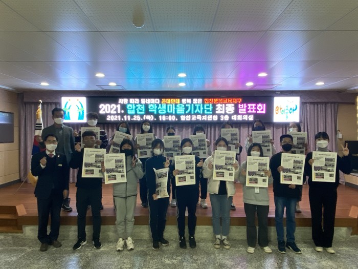 2021. 합천 학생마을기자단 기자 학생들은 기자단 특성화 강의, 지역 현장 체험, 1:1 멘토링 활동 등의 언론, 방송. 마을활동 등의 과정을 거쳐 우리 학교 이야기, 합천 둘러보기, 합천 생각하기라는 주제로 합천에 관한 다양한 내용을 글과 영상으로 제작하고 이를 바탕으로 합천 학생마을신문을 발간하였다.