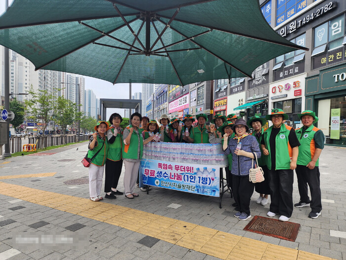 이번 행사는 연일 계속되는 폭염 속에서 시민들의 건강을 지키고 무더위 쉼터 역할을 톡톡히 하기 위해 마련됐으며, 자율방재단 단원들이 직접 거리로 나서 시원한 생수 500병을 시민들에게 무료로 배부했다.