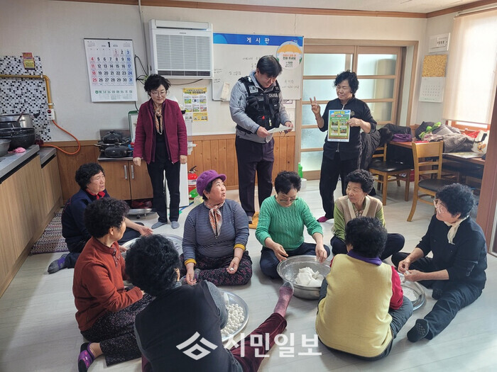 | ▲ 해남경찰서 읍내지구대, 해남읍 남천마을회관 이용 어르신 대상으로 보이스피싱 예방, 치매노인 및 노인학대(경제적 학대), 겨울철 안전사고 예방 등 홍보 / 해남경찰서 제공 |