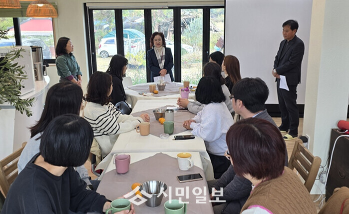 | ▲ 조연주 해남교육지원청 교육장이 지난 17일 해남군 현산면 소재 ‘올리브 숲 힐링가든’에서 학부모의 심리적 회복과 정서적 치유를 위한 “올리브 숲 현실치료(RT) 프로그램”에 참석해 인사말을 하고 있다. / 해남교육지원청 제공 |