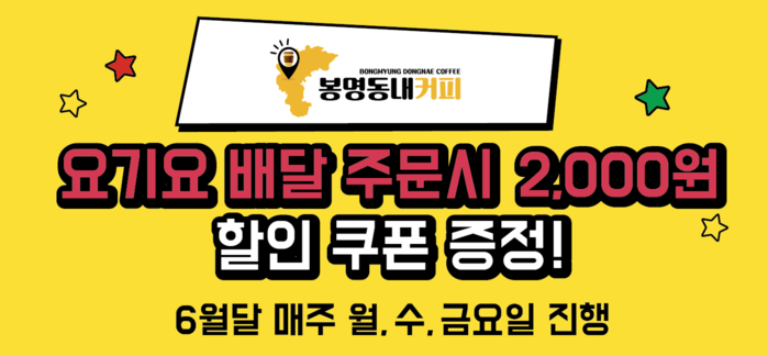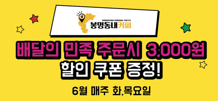 배달 카페 전문 프랜차이즈 ‘봉명동내커피’는 배달의 민족과 요기요에서 누구나 사용할 수 있는 배달 주문 할인 프로모션 쿠폰행사를 진행한다고 밝혔다.