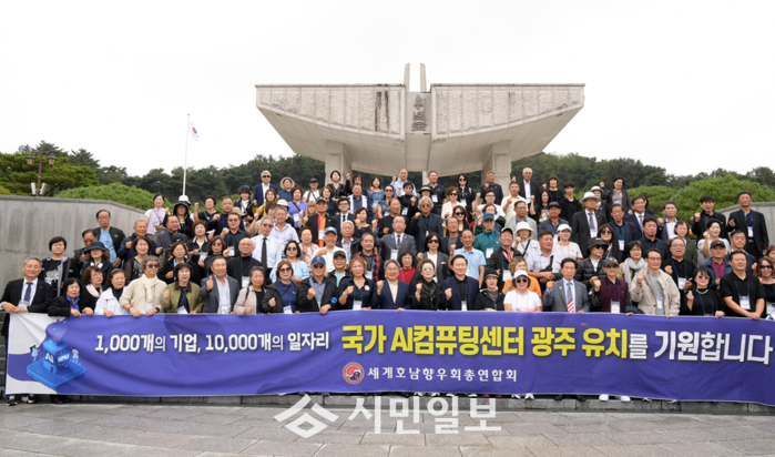 | ▲ 강기정 광주광역시장이 4일 국립5·18민주묘지를 방문한 세계호남향우회 총연합회 회원들과 함께 '국가AI컴퓨팅센터 유치 기원' 플래카드를 들고 기념촬영을 하고 있다. /광주광역시 제공 |
