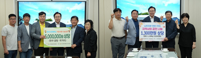 [나주=황승순 기자]전라남도 나주시(시장 윤병태)는 (사)전국한우협회 나주시지부와 (사)대한한돈협회 나주지부가 지난 24일 500만 원 상당의 한우 국거리·곰탕 110박스와 1300만 원 상당의 한돈 565박스(1130kg)을 어려운 이웃을 위해 각각 기탁했다고 밝혔다.