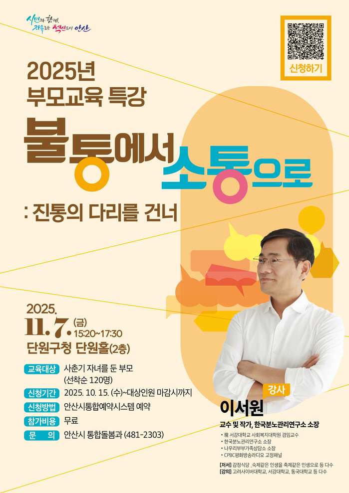 | ▲ ‘2025년 부모교육 특강 – 불통에서 소통으로: 진통의 다리를 건너’개최 안내 포스터 /자료제공=안산시 |