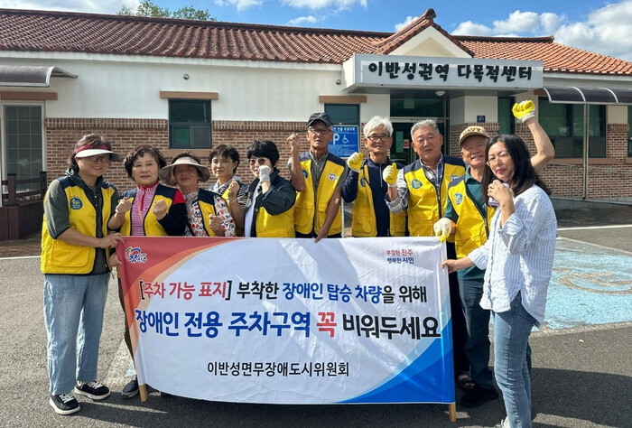 이날 무장애도시 이반성면위원회는 노후로 훼손된 정수문화마을 내 장애인전용주차구역을 깨끗하게 도색하여 보행성 장애인들이 더욱 편리하게 주차할 수 있도록 장애인 편의시설 환경을 개선하고, 장애인 전용주차구역 준수에 대한 인식 제고를 위한 캠페인을 실시했다.