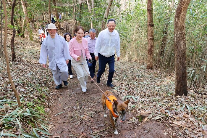 | ▲ 명현관 해남군수(오른 쪽)가 지난 23일 해남군 송지면 소재 달마산에 조성된 달마고도 걷기 축제에서 미황사 향문주지스님과 미스트롯에서 유명세를 얻은 해남출신 가수 미스김 등과 함께 트래킹을 하고 있다. / 해남군 제공 |