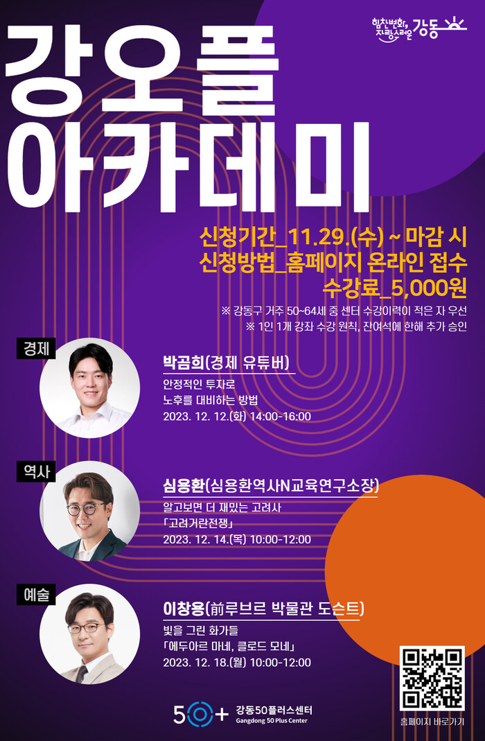 이번 강오플아카데미는 12월 12일부터 18일까지 총 3회에 걸쳐 운영된다. 강사로는 ▲56만 구독자를 보유한 경제 유튜버 박곰희 작가 ▲여러 방송에서 진정성 있는 역사 이야기를 전하는 심용환 역사학자 ▲그림 읽어주는 남자 이창용 전 루브르 박물관 도슨트를 초청해 경제, 역사, 예술 분야에 대한 지식의 향연을 펼친다.