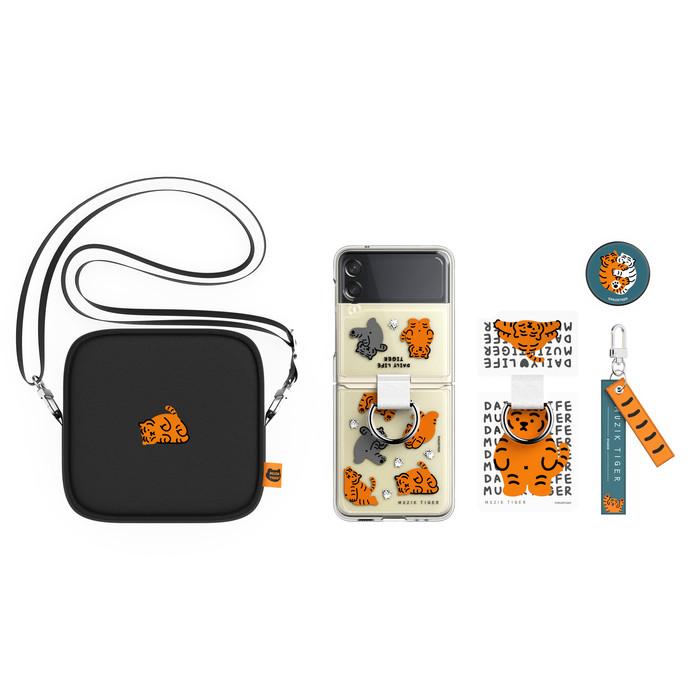 패키지는 갤럭시 Z 플립3 단말기, 클리어커버, 무직타이거 액세서리(무직타이거 키링, 팔레트 2종, 가방, 그립톡)로 구성돼 있다.