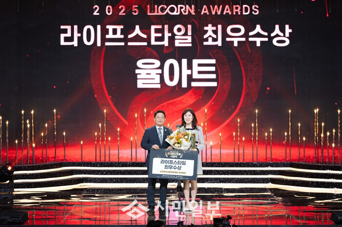 올해 총 7,147개 기업이 도전했고, 지난 5월 진행된 1차 오디션에서 160개 기업이 통과, 2차 오디션을 통해 최종 60개 기업이 라이콘 기업으로 선정됐다. 율아트는 그 중에서도 라이프스타일 최고상인 최우수상을 수상했다.