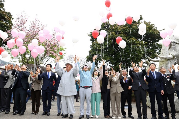 | ▲ 강진원 강진군수(앞줄 왼 쪽부터 일곱 번째)가 지난 6일 남미륵사 서부해당화 봄꽃축제장에서 이호남 강진군축제위원장, 남미륵사 법흥 주지스님, 내외빈 등과 함께 개장 시작을 알리는 풍선날리기 퍼포먼스를 하고 있다. / 강진군 제공 |