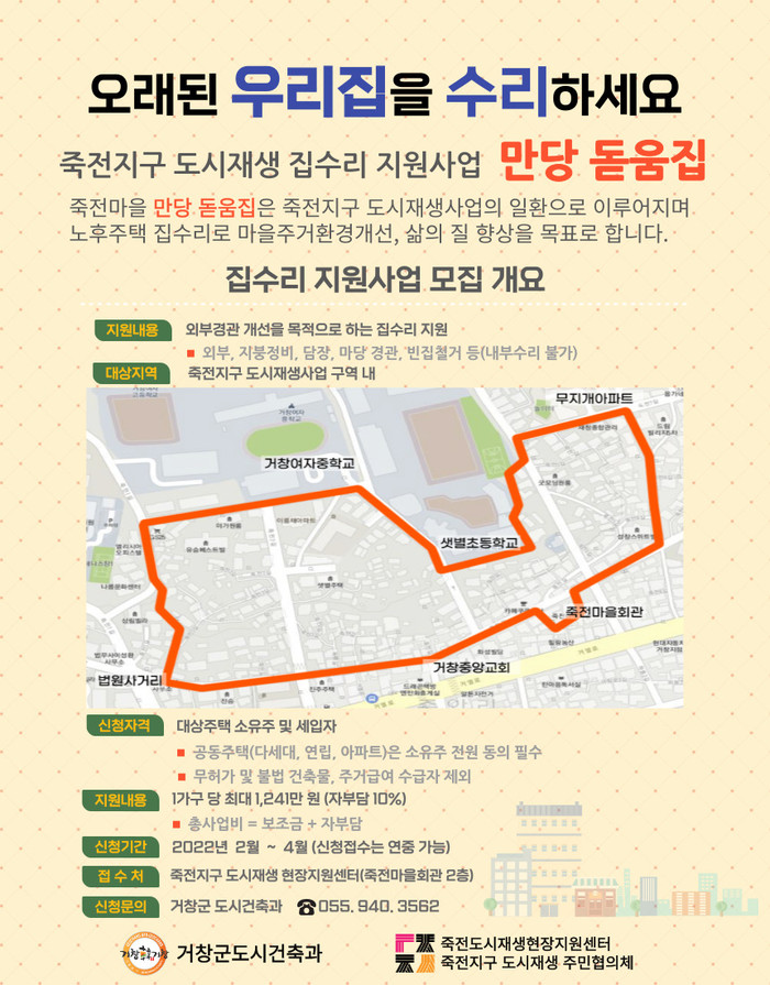신청방법은 3월 11일까지 노후주택 소유주가 죽전지구 도시재생현장지원센터를 방문해 신청서를 제출하면 된다. 자세한 내용은 거창군 홈페이지 및 도시건축과를 통해 확인할 수 있다.