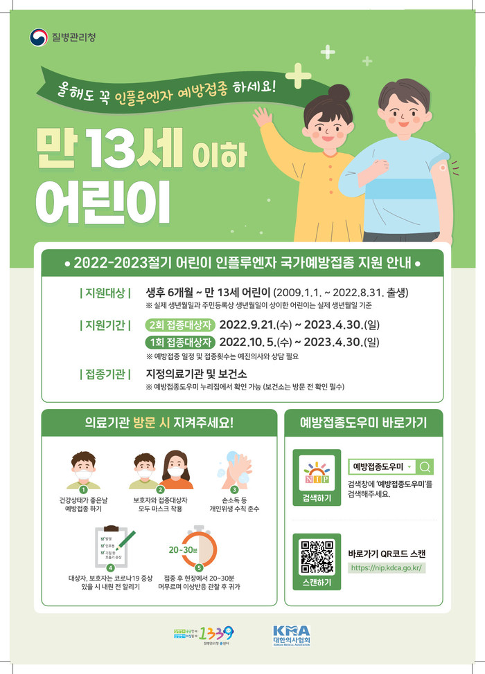 10월 5일부터는 1회 접종 대상 어린이(2009.1.1.~2022.8.31. 출생)와 임신부의 접종이 시작되고, 어르신 대상으로 만 75세 이상은 10월 12일부터, 만 70~74세는 10월 17일부터, 만 65~69세는 10월 20일부터 12월 31일까지 순차적으로 인플루엔자 무료 예방접종 사업이 진행된다.