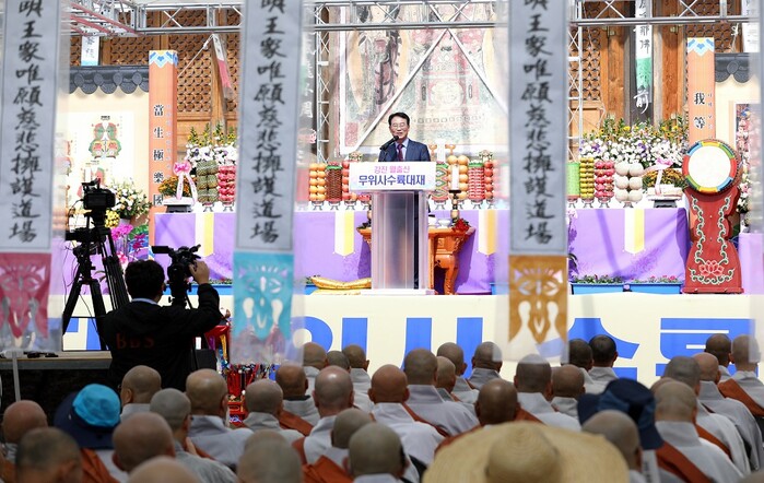 | ▲ 강진원 강진군수가 지난 5일 성전면 소재 무위사 대적광전 앞에서열린 수륙대재에 참석해 인사말을 하고 있다. / 강진군 제공 |