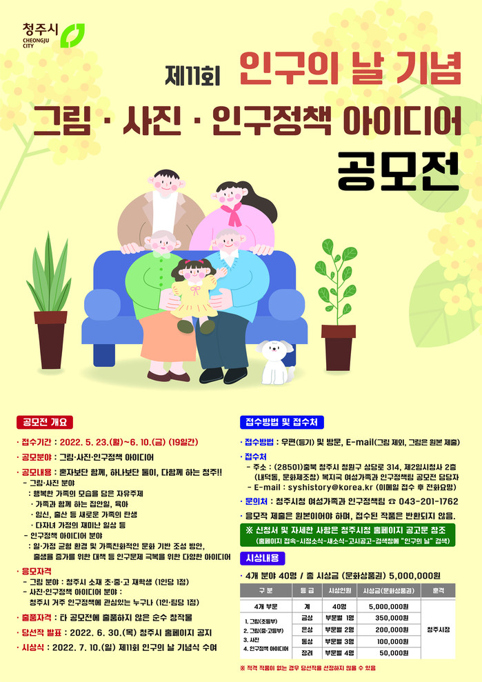 시 관계자는 “이번 인구의 날 기념 공모전을 통해 청주시민이 다함께 인구문제에 대한 극복 방안을 고민하고, 가족의 의미와 소중함을 재고하는 계기가 되길 바란다”고 말했다.