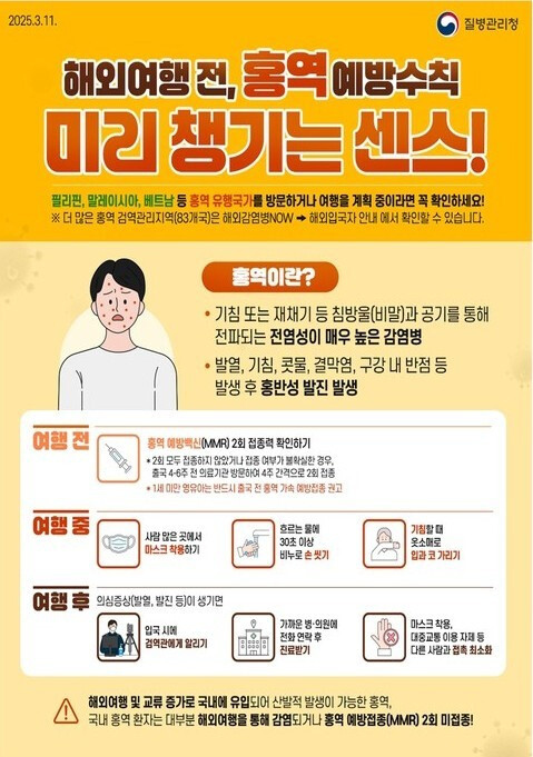 우리나라처럼 평소 홍역 발생이 거의 없는 국가에서도 해외 유입 사례로 인해 지역사회 전파 위험이 커지고 있어 여행 전 예방접종의 중요성이 더욱 강조되고 있다.