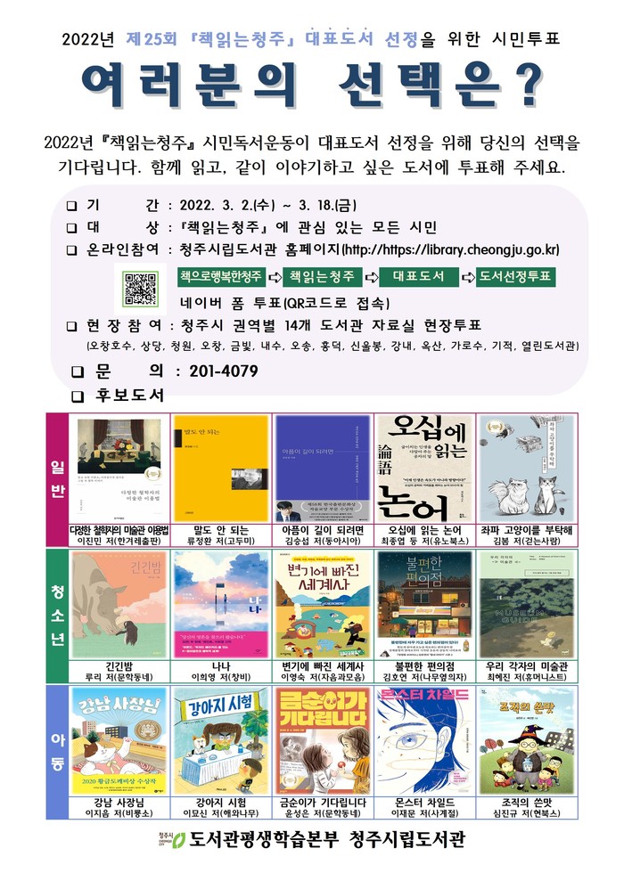 청주시립도서관이 ‘2022년 책읽는청주 시민독서운동’ 대표도서 선정을 위해 3월 2일부터 18일까지 후보도서 시민투표를 진행한다.