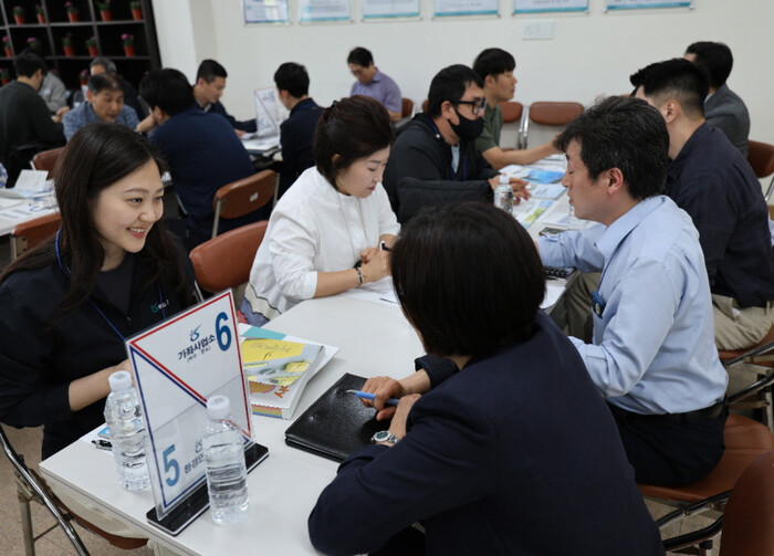 | 제8회 공공구매 상담회에서 참여 기업과 공단 관계자가 구매 상담을 하고 있다. (사진=인천환경공단) |