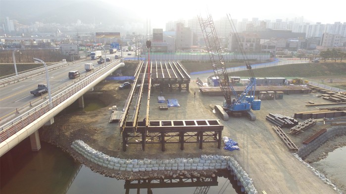 양산천을 가로지르는 하천 교량공사 특성상 여름 우기,장마철을 피해 공사를 진행해야 하는 현지여건을 감안하여 동절기 시공계획 승인하여 3월중 교통우회용 가설교량 개통을 목표로 하고 있다.