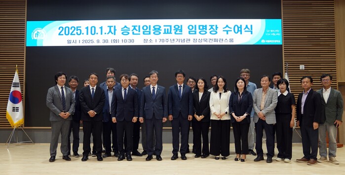 2025학년도 2학기 승진 임용자는 다음과 같다. △교수 승진(도시계획및조경학부 박지환, 기계조선해양공학부 최정규) △부교수 승진(도시계획및조경학부 이창훈, 경제무역학부 정한나, 경제무역학부 임선영, 아트앤디자인학부 이예린, 아트앤디자인학부 백종성, 윤리교육과 황성규)