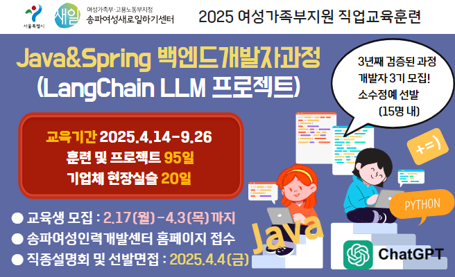 이 과정은 2025년 여성가족부 직업교육훈련의 일환으로, 미취업 청년 여성들에게 LangChain을 활용한 LLM(대형 언어 모델) 기반 실무형 백엔드 개발자로 성장할 수 있는 기회를 제공하기 위해 기획되었다. 또한 심층적인 취업 상담과 연계를 지원하여 참가자들이 취업에 성공할 수 있도록 돕는다.