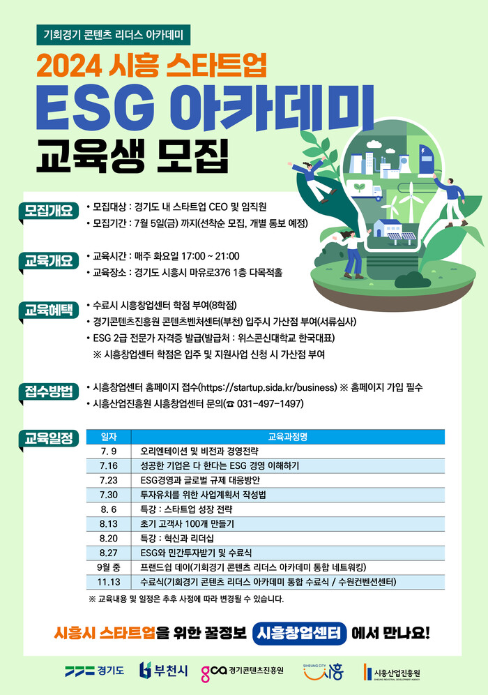 [시흥=송윤근 기자] 경기 시흥산업진흥원(원장 유병욱)은 오는 7월 5일까지 “2024 시흥 스타트업 ESG 아카데미(기회경기 콘텐츠 리더스 아카데미) 교육생을 모집한다.