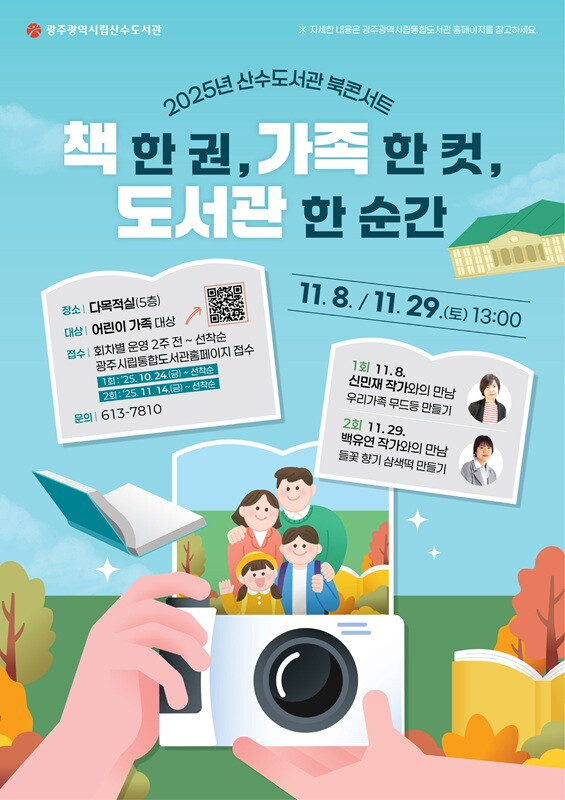 [광주=정찬남 기자] 광주광역시립산수도서관이 다음달 11월 8일과 29일 두 차례 ‘가족을 위한 북콘서트’를 개최한다.
