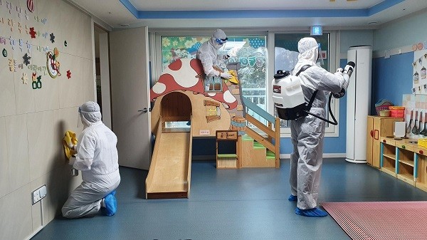 | ▲ 천안 곰돌이어린이집 소독 모습. 사진제공 : (주)비니즈(디어웰) |
