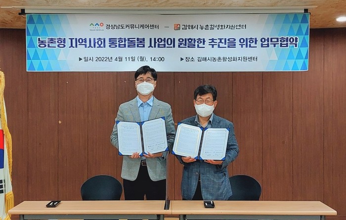 경상남도 커뮤니티케어센터와 김해시 농촌활성화지원센터가 지난 11일 농촌형 지역사회 통합돌봄 사업의 원활한 추진을 위한 업무협약(MOU)을 체결했다.