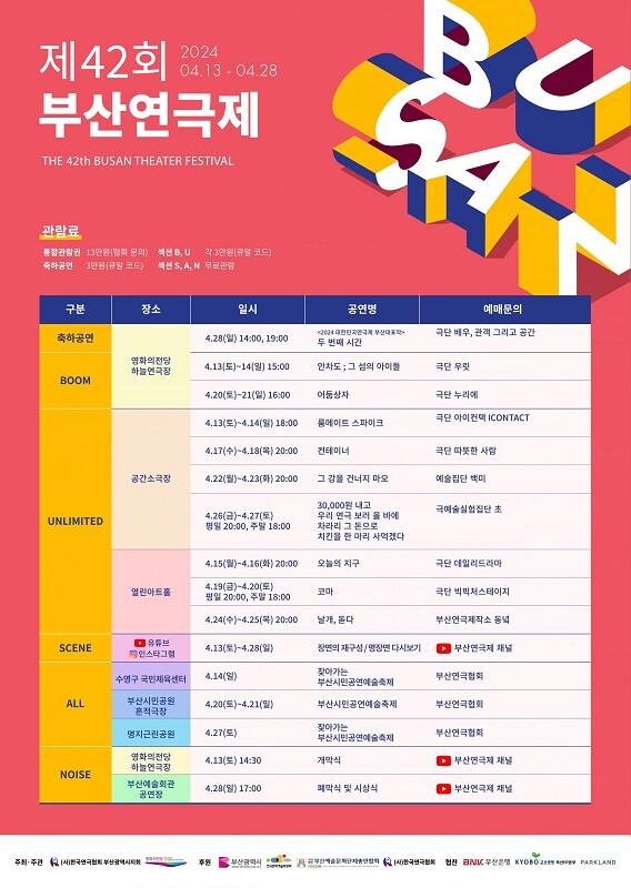 4월13일 부산 영화의 전당 개막식을 시작으로 4월29일까지 영화의 전당 하늘연극장, 부산예술회관 공연장, 공간 소극장, 열린 아트홀, 부산시민공원, 명지근린공원, 수영구 국민체육센터, 유튜브 ‘부산연극제’ 채널에서 함께 할 수 있다.