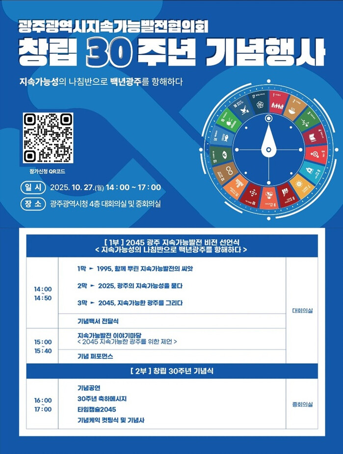 정현윤 기후환경국장은 “광주지속가능발전협의회 30주년 기념행사는 광주시가 지속가능한 미래를 향한 의지를 다지는 중요한 자리”라며 “많은 시민들이 관심을 갖고 적극 참여해 주길 바란다”고 말했다.