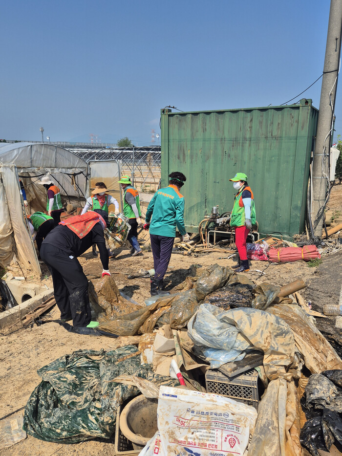 이날 강남구 자율방재단원 30명이 투입돼 침수로 붕괴된 비닐하우스 정리와 폐비닐·잔해물 수거 등 피해 현장 복구 작업에 구슬땀을 흘렸다.