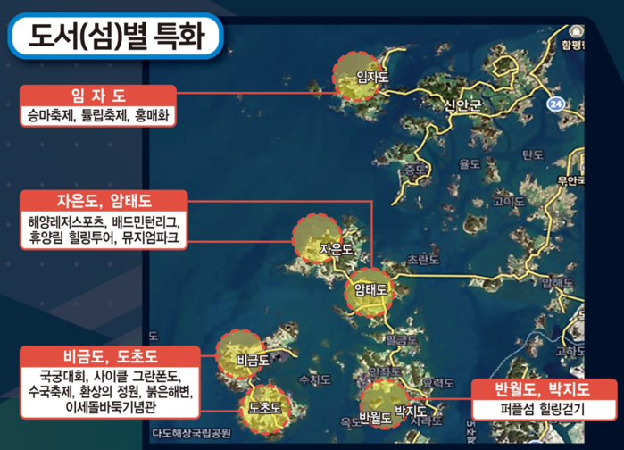 군은‘사계절 꽃피는 플로피아’,‘1도 1뮤지엄’시책과 연계한‘플로피아 스포츠축제’를 주요 콘셉트로 ▲(비금·도초권) 사이클 그란폰도(비경쟁 방식의 동호인 대회) ▲(중부권) 배드민턴 리그 ▲(자은) 해양레저스포츠축제 ▲(임자) 해변승마축제 ▲(안좌) 퍼플섬 힐링 걷기 등 프로그램을 도입했다.