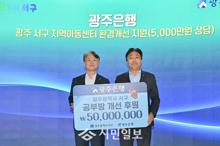 [광주=정찬남 기자] 김이강 광주시 서구청장(왼 쪽)이 지난 11일 서구청 1층 기부자 명예의 전당에서 고병일 광주은행장으로부터 지역아동센터 환경개보수 지원을 위한 5000만 원 상당의 ‘희망이 꽃피는 공부방’ 후원금을 기탁 받은 후 기념촬영을 하고 있다. / 광주 서구청 제공