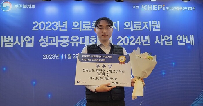 [강진=정찬남 기자] 전남 강진군은 지난 29일, 서울에서 개최된 ‘2023년 의료취약지 의료지원 시범사업 성과대회’ 개인 부문에서 도암보건지소 정영훈 공중보건의사가 우수상(한국건강증진개발원장상)을 수상했다고 밝혔다.