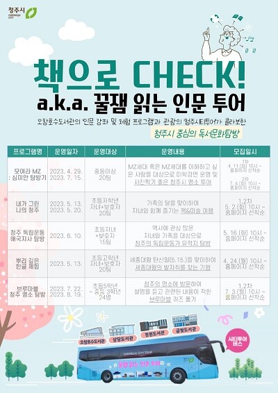 [청주=최성일 기자] 청주시는 인문학과 청주시 관광 투어를 접목한 독서문화탐방 ‘책으로 첵! 꿀잼 읽는 인문 투어’(이하 인문 투어)를 4월부터 8월까지 총 8회 운영한다고 10일 밝혔다.