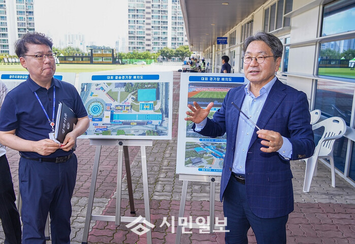 | ▲ 강기정 광주광역시장이 지난 20일 오전 2025 광주 세계양궁선수권대회를 앞두고 남구 광주국제양궁장을 찾아 성공개최를 위한 최종 시설점검을 하고 있다./광주광역시 제공 |