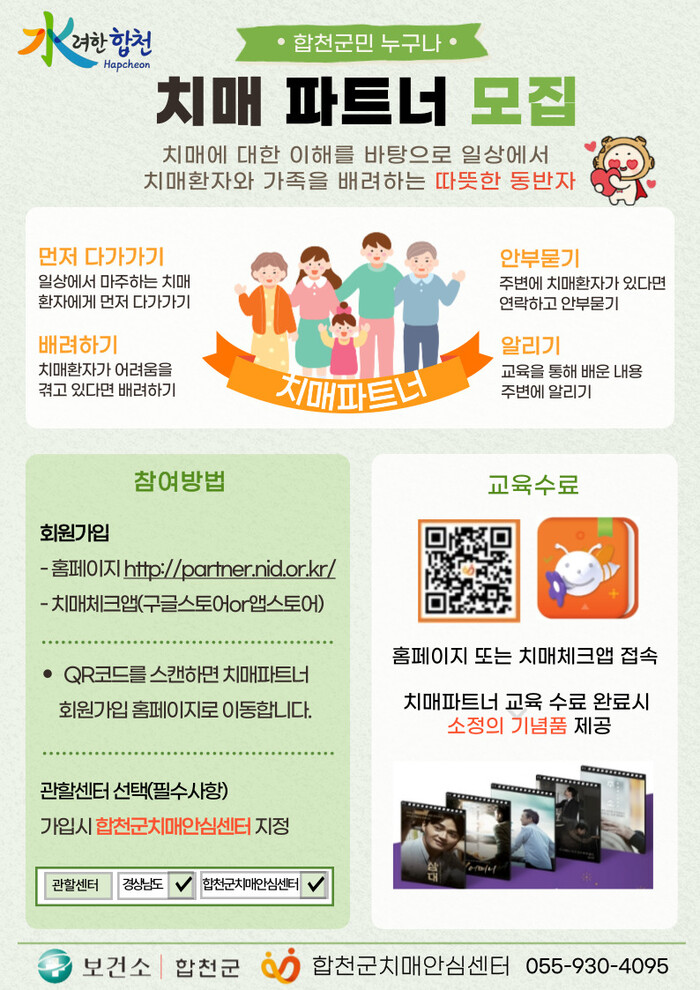 초등학생 이상이면 누구나 치매 파트너가 될 수 있으며, 참여 방법은 온라인 교육(치매 파트너 홈페이지, 치매 체크 앱)회원 가입 후 필수교육강좌 동영상 5편을 모두 시청하고 퀴즈를 풀면 치매 파트너가 될 수 있다. 온라인 교육 이수가 힘든 경우, 합천군 치매안심센터로 치매 파트너 교육을 신청하면 오프라인 교육도 가능하다. 신규 치매 파트너에게는 치매 파트너증과 소정의 치매 파트너 기념품을 제공할 계획이다.